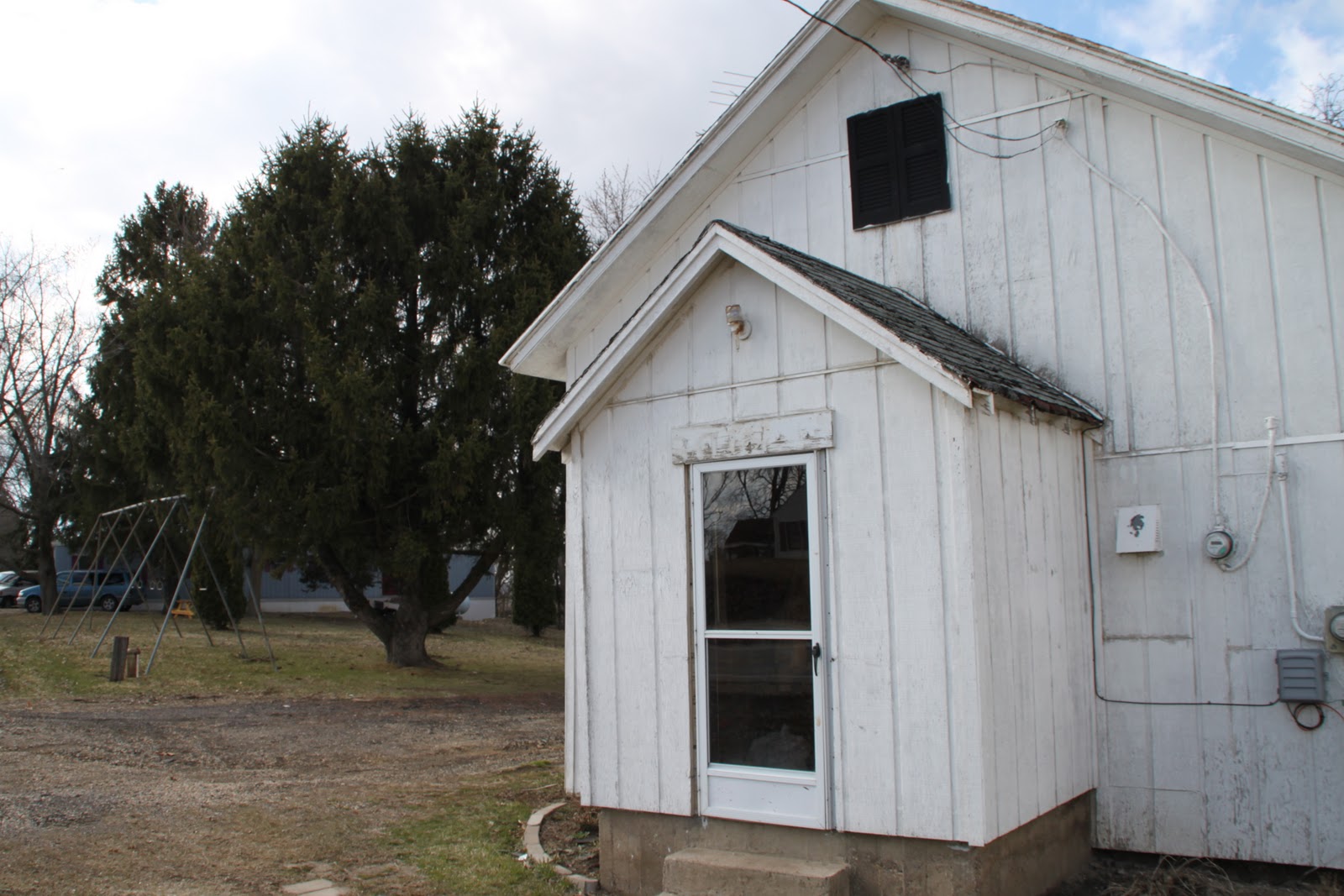 This school is located on Old Highway Road (old US20) between Epworth and Centralia, 1.6 miles west of Y21. It is at the SE corner of the junction with Dutch Lane Road. There is a cemetery to the south of the building which appears to be much older than the school. The inside has been trashed. You can see that electricity had been brought in at some time, with one old fluorescent fixture remaining.