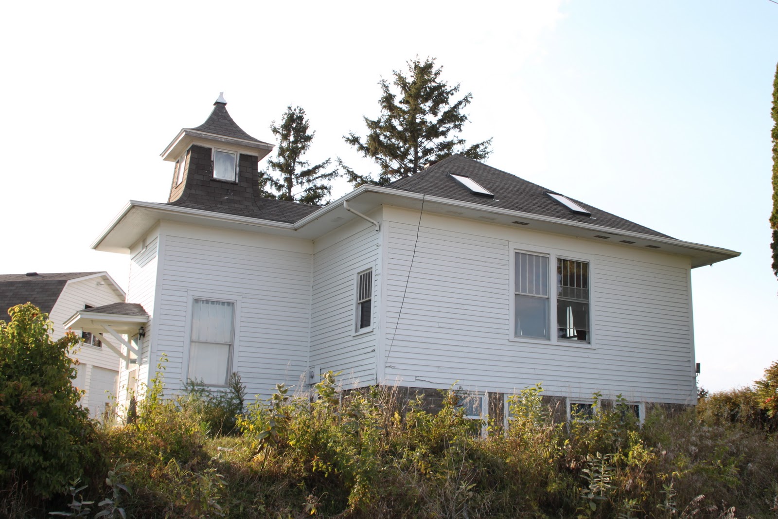 From Iowa City, junction of I-380 and Melrose Ave/IWV Rd, proceed west on IWV Rd for one mile to the intersection of Hurt Rd. The school is on the SE corner, although Hurt does not extend south past IWV. It is was used as a residence but is now derelict. The first shot is looking at the NW corner of the house.