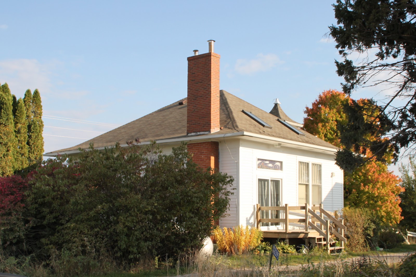 On the south side of town, on Forevergreen Road. Proceed east of Highway 965 on Forevergreen to the intersection of Front Street. The school is now a house on the south side of Evergreen at the junction of the two streets. We could have photographed this one quite a while back, but waited until a nice day after the leaves fell so it would be seen better. The old pump still stands in the front yard, although the school building itself has undergone much modification. Address is 101 Evergreen.