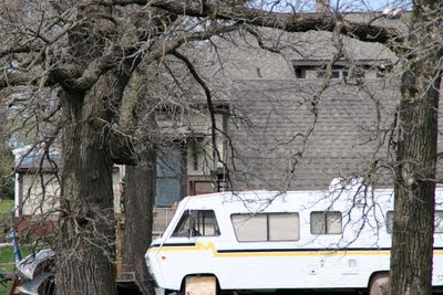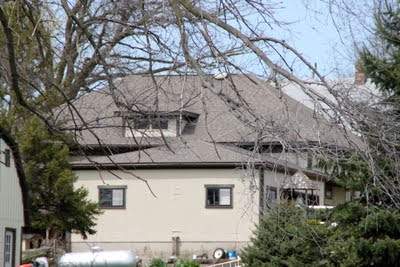 For the next two shots we had to go a block away to an alley where we could get a view of the house, what little view could be had. These are of the south side of the building. You can see the little dormer window still, and the west entrance door to the school is still used as a back door.