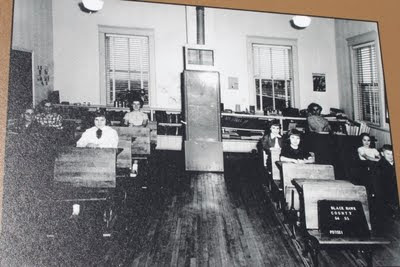 The landowner-farmer, Steve Sage, invited us to tour the inside. Mr. Sage attended this school from 1945 until 1953 and for a while used this school as a hay barn, as this photo from their display shows: