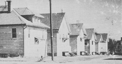 The first photo is from the book, and shows the first school moving into town. The second photo shows the school buildings lined up along Third St, with the anchor point being the NW corner of Third and Maple.