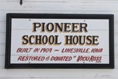 3/10/13 update: Apparently this school was placed on its new foundation not long before we saw it. On 3/8/13 we stopped here again, and learned that the school is from Lineville, IA, which is at the SE corner of Decatur county (their sign says "Linesville"). It was built in 1909. Apparently it was restored at its old location and then moved to its current site, because photos of the move show it in its current condition. There were three photos hanging on the wall, depicting this school in its original state: