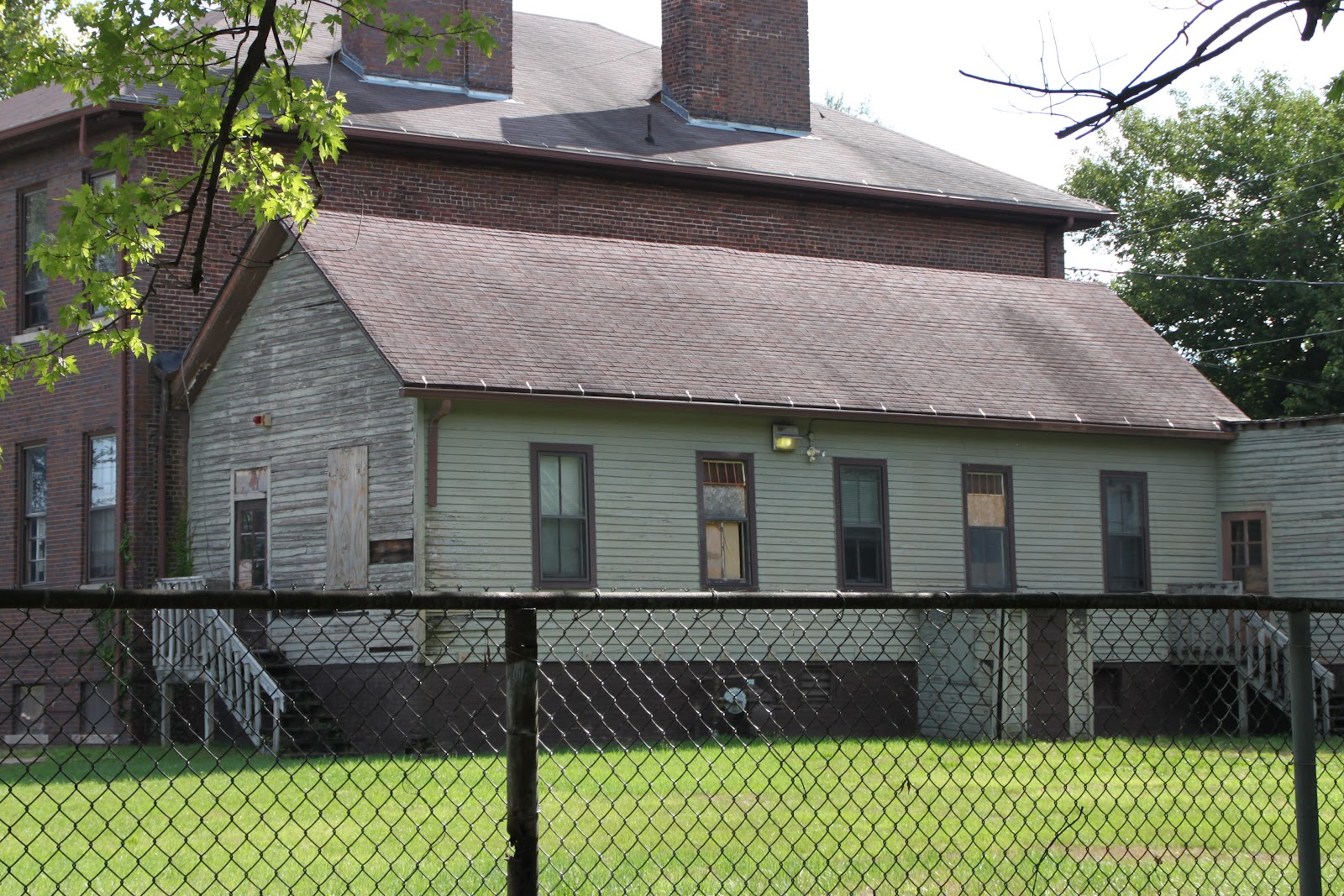 No information found about where Pleasant Corners school was moved from, or the date it was built. It is located NW of the downtown Des Moines, area at 1350 E. Washington Ave. This is at the NW corner of Washington and E. 14th St. There is a brick building at this corner which used to be Whittier School, which faces Washington St. Apparently at one time Pleasant Corners was moved here as an addition to the school on its north side. By 1998 the building was used as the Boys & Girls Club of Central Iowa, but appeared to be vacant at the time of our photo. I was told by the neighbor on the north side of the school that the Pleasant Corners building is to be made into an art gallery.