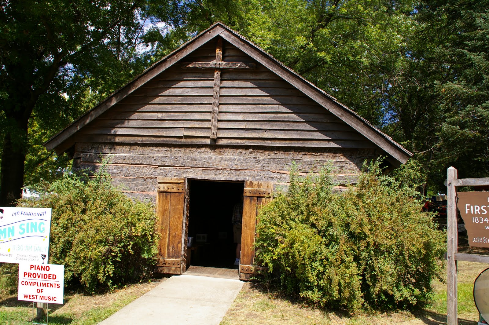 This 1834 Methodist Church was the first church in Iowa, built in Dubuque in Washington Square. It was also used as a school. It has been relocated to the Iowa State Fairgrounds in Des Moines.