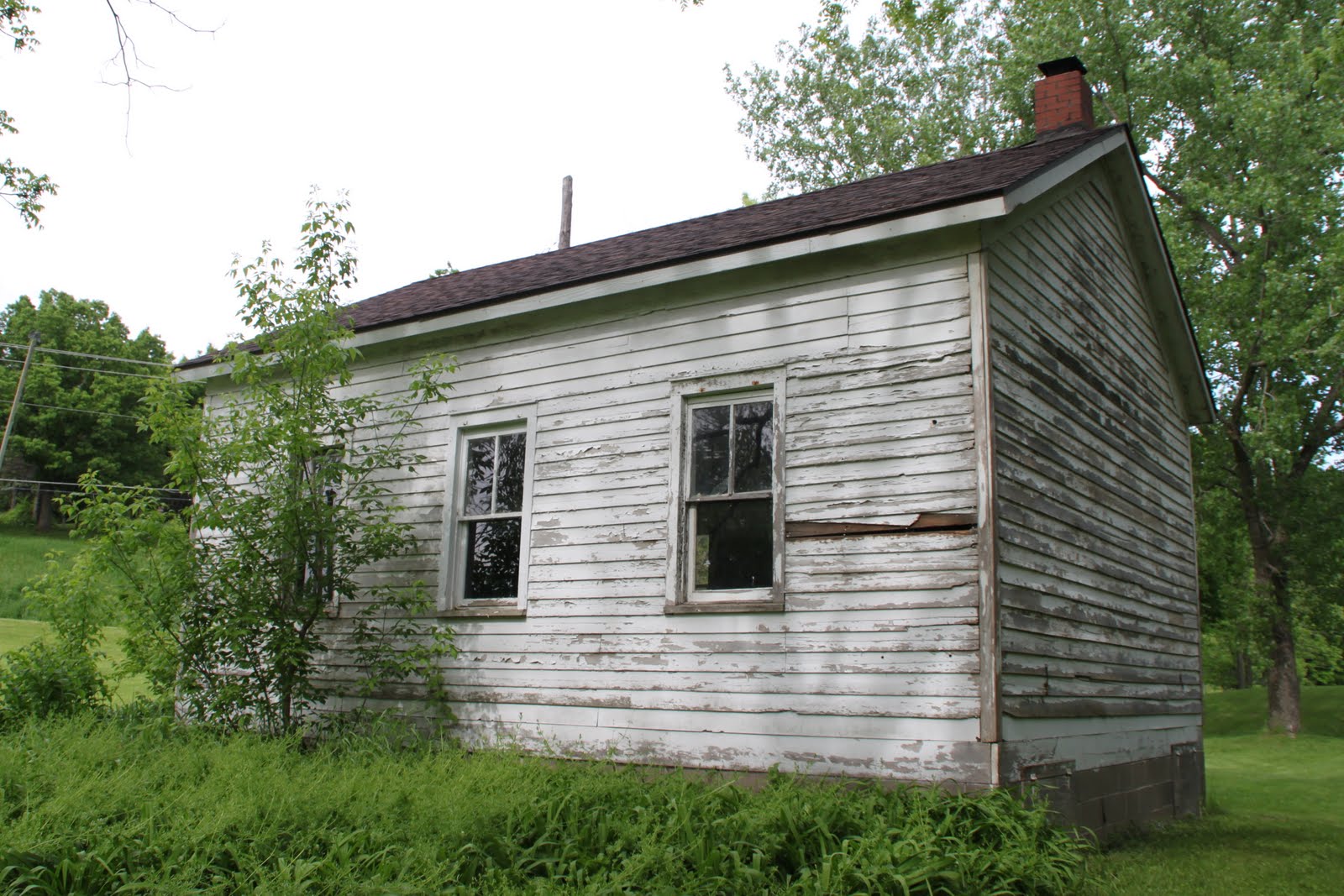 North of Blue Grass. Located on the SE corner of 165th St and 60th Ave on the county line, facing east. Go north out of Blue Grass on 70th Ave/N. Mississippi St. to 165th St. and turn west. Go 2 miles west to the school. It is a home, address 16485 60th Ave, Blue Grass. Photographed 10/30/21.