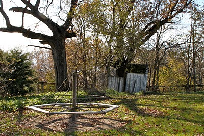 Looking over the restored merry-go-round to the unrestored outhouse.