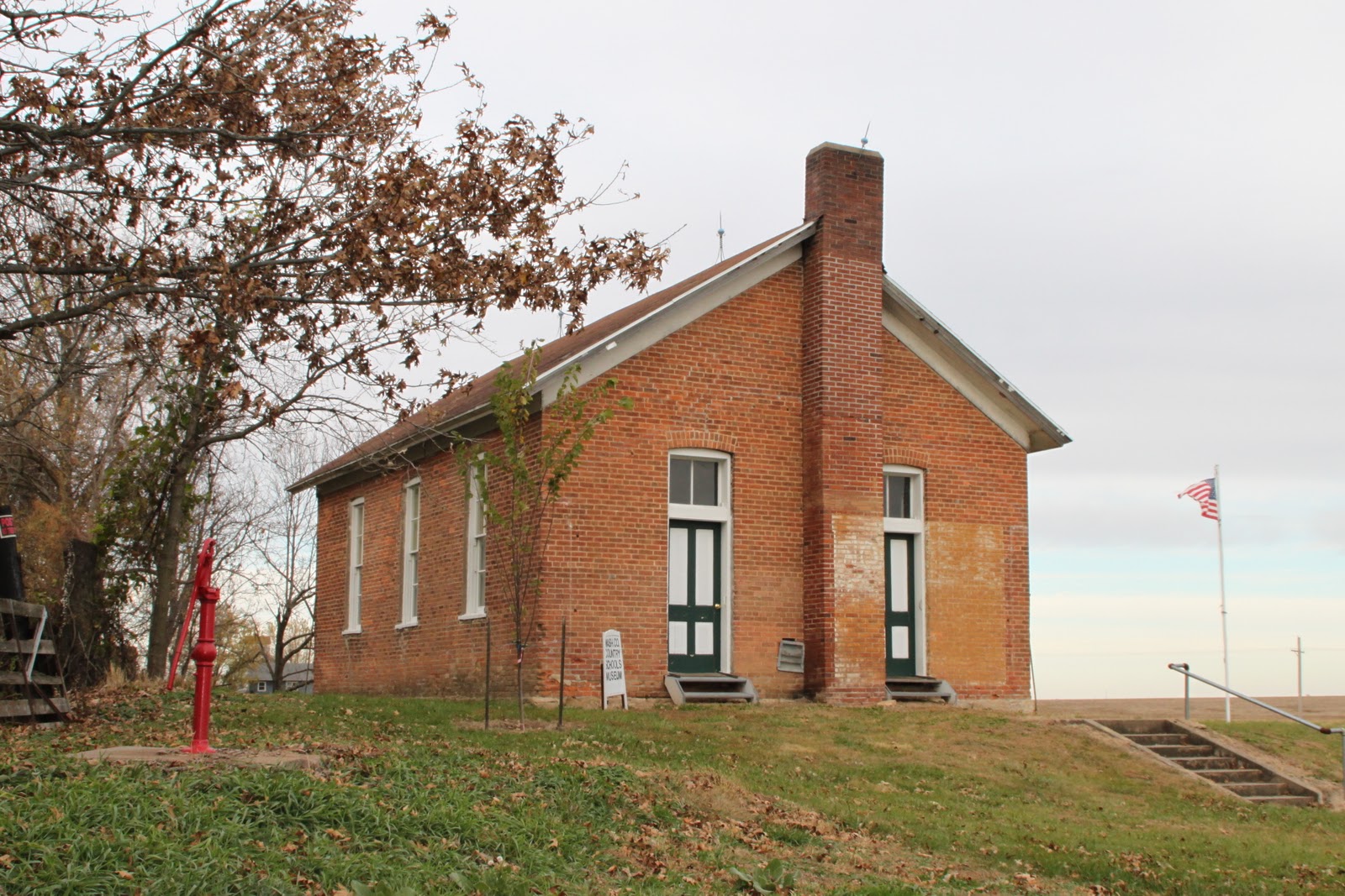 Built ca.1850. Nicknamed “Straw College” because straw was stuffed behind the wainscoting during the winter for insulation. Originally on the prairie south of Kalona. Was part of the Mid-Prairie School district and was used as a typing room by them until they donated it to the Kalona Historical Village in 1972. It was restored in 1973.
